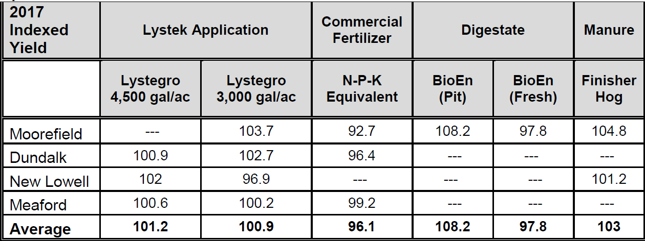 Table 7 shows the plot yields for the various treatments. A frost in late August affected the New Lowell site and resulted in significant yield reductions at that site. As a result, the data for 2017 was indexed to give a better indication of treatment response. The New Lowell site also had the Lystegro and Hog manure side-dressed in mid-June. This site did not have a commercial fertilizer check.