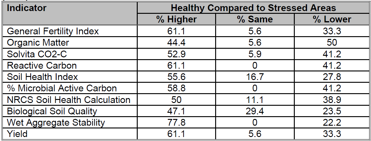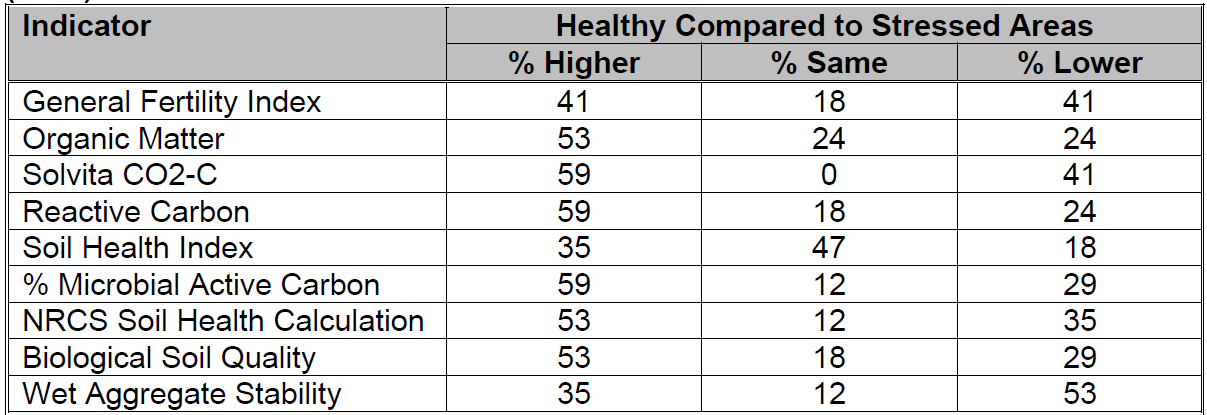 Table 1. Soil Health Indicators of Healthy Areas Compared to Stressed Areas (2018)