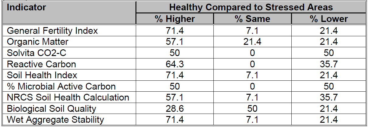 Table 1 below lists several soil health indicators comparing healthy areas to stressed areas. Organic matter, Solvita CO2-C, reactive carbon, % microbial active carbon, NRCS soil health calculation and biological soil quality appear to be valid soil health indicators with slightly half of the “healthy” areas displaying higher values than the “stressed” areas.
