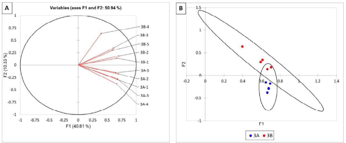 Figure 5. Statistical analysis of TRFLP of the bacterial communities in corn roots of field 3. Bacterial communities are represented as vectors (A) and as points with 95% confidence circles (B).