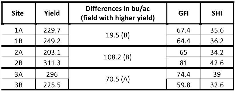 • The Soil health Index predicted the 2 sites having the greatest yield differences (fields 2 and 3). Site 1 with lower yield differences (less than 20 bu/ac) had similar GFI and SHI values.