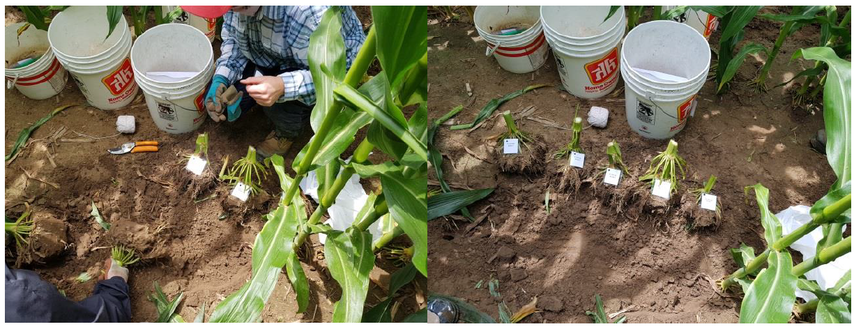 One stressed area and one healthy area were sampled in each field. At each sampling point 5 corn root balls were dug up and individually bagged and tagged, see figure 2. The letters A and B were randomly assigned to the healthy and stressed samples. The growth stage of each plant, sample date and GPS coordinates were recorded. Twenty soil cores (six inch depth) were taken for fertility and aggregate stability analysis. The soil and root balls were sent to A & L Laboratories with in a day or two of sampling. The soil sample was analyzed for fertility. Soil from the root ball was analyzed using the A & L Laboratories soil health test Vitellus and a portion of the root from each root ball was analyzed to assess the microbial community. The aggregate stability analysis was completed in Dr. Laura Van Eerd’s lab at University of Guelph Ridgetown Campus using the automated wet sieving method by an Ontario Ministry of Agriculture, Food and Rural Affairs (OMAFRA) summer student.