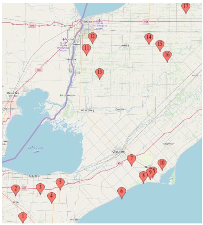 2018 was the first year of this project. 17 soil and crop members volunteered fields for the project. There was a pretty good distribution of fields from west Essex county to north Lambton county, see figure 3. Most fields were clay, clay loam or silty clay loam soils with one being a loam soil. It was a challenging year to start the project as the wet spring delayed planting for many and then it turned dry in many areas. The delayed planting made it difficult to know when the fields would be ready to be flown for the NDVI. Some of the NDVI maps did not show a lot of differences in the field making it difficult to choose healthy and stressed spots in the field.