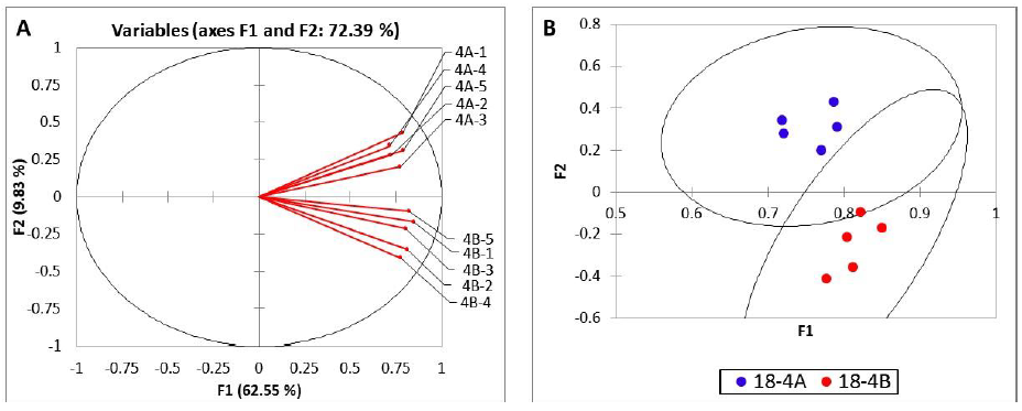 The microbial communities were assessed on the roots of 11 of the 17 fields. Three of the 11 fields show differences in the communities although they were not statistically significant. Figure 5 shows one of the fields where there were some differences. Graph A shows the A root communities are separate from the B communities on the graph. The statistical analysis on graph B shows the blue points separate from the red points but the ovals overlap indicating the communities are not completely different. Figure 6 is a field that did not show any differences. Graph A has a mixture of A and B points above and below the line. The blue and red points are clustered together in graph B and the ovals mostly overlap indicating the communities are the same.