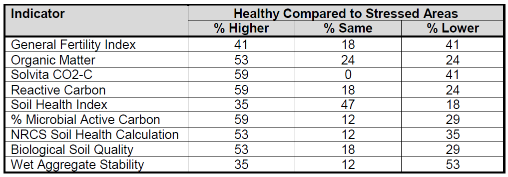 Table 2. Soil Health Indicators of Healthy Areas Compared to Stressed Areas
