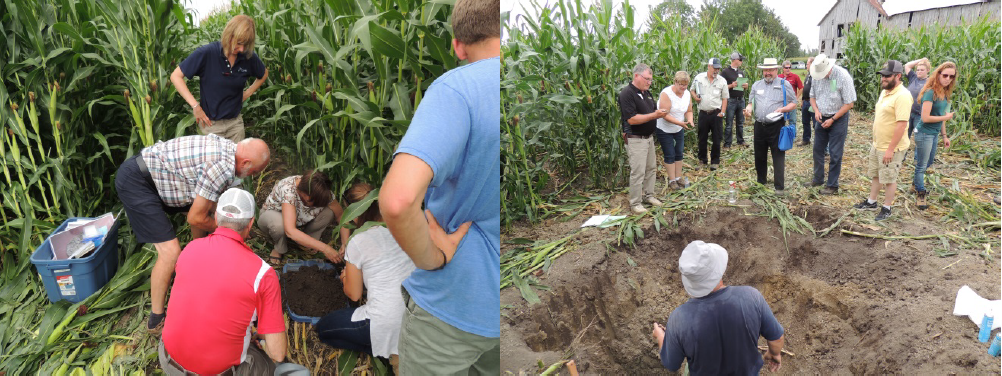 Adam Gillespie introduced the soils of the region and touched on their diversity and different characteristics across the landscape, followed by Paul Sullivan, who spoke to the group about managing soil variability at the field scale. Then, participants split into groups to visit several soil pits that highlighted important distinguishing properties of different soil profiles: texture, structure, and organic matter.
