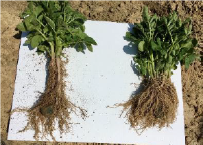 Figure 10. July 9, 2019 – root development comparison of inoculated potatoes (right) versus non-inoculated roots (left).