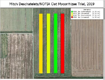 The oat plot seemed to perform well this year, given the weather. The oats were planted into soil with medium to low phosphorus and potassium but with a good soil pH. A site visit on July 9, 2019 showed slightly more root development in the oats treated with the inoculant (see figure 5). The plot was harvested on August 23, 2019. A weigh wagon was used to measure yield from each strip and measured in bushels per acre (see figure 6 and table 1). Results shows ~1.5% greater yield for oats treated with mycorrhizal inoculant than without. Looking at this from an economics perspective, given market prices, this could produce up to $10/acre greater revenue.