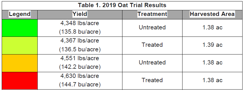 The oat plot seemed to perform well this year, given the weather. The oats were planted into soil with medium to low phosphorus and potassium but with a good soil pH. A site visit on July 9, 2019 showed slightly more root development in the oats treated with the inoculant (see figure 5). The plot was harvested on August 23, 2019. A weigh wagon was used to measure yield from each strip and measured in bushels per acre (see figure 6 and table 1). Results shows ~1.5% greater yield for oats treated with mycorrhizal inoculant than without. Looking at this from an economics perspective, given market prices, this could produce up to $10/acre greater revenue.
