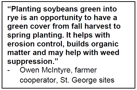 If you’re new to rye as a cover crop, gain confidence by terminating it a couple of weeks before planting soybeans in the spring. If you’re more experienced, leave a couple strips to be sprayed after soybean planting this coming spring and see how it works on your farm. Have a goal in mind – is it weed management, building organic matter or overall soil health? And finally, be flexible and adapt your plans according to weather conditions.