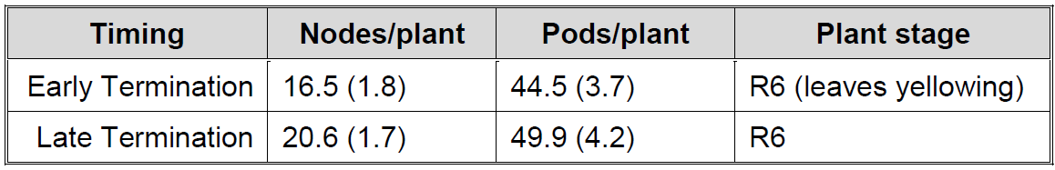 Table 5. Number of nodes and pods per plant at Brantford 2018 site observed on September 6, 2018. Value represents average and number in brackets represents standard deviation.
