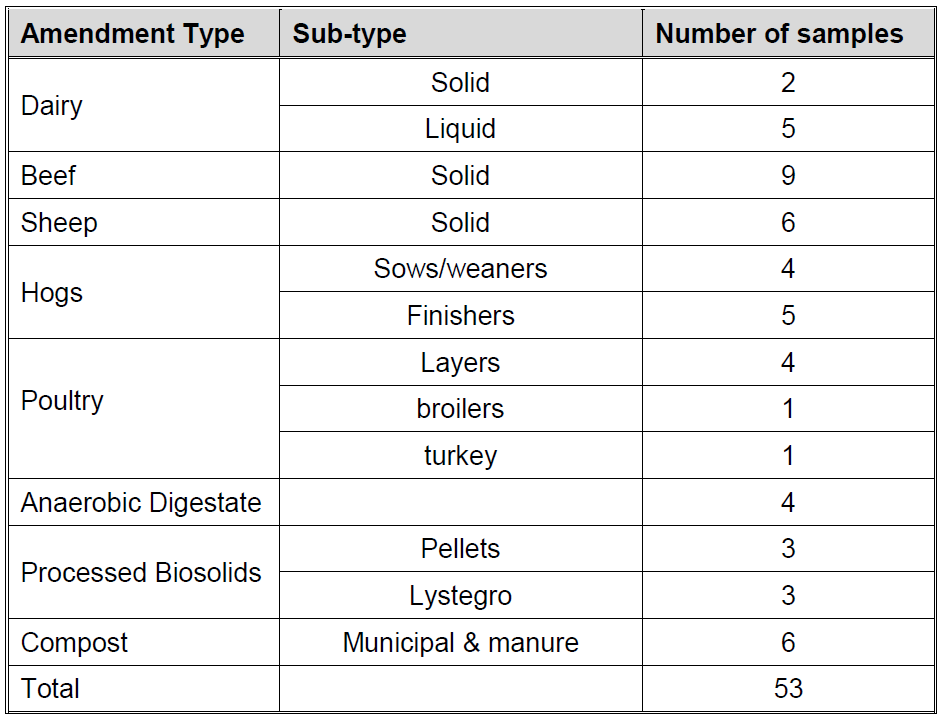 Data used to predict the risk of phosphorus loss from livestock manure and other organic amendments is currently sourced from the USA. In the 2018 Canada-Ontario Lake Erie Action Plan, Ontario committed to “continue to conduct research to improve modelling capability to quantify phosphorus reductions from BMPs at a landscape scale.” This project (BMPVD 2017/18 – WEP01) attempted to verify and fine-tune the water extractable phosphorus data from manure using samples taken from a variety of Ontario livestock farms and from commonly used municipally-sourced organic amendments. The US data does not include all livestock species (e.g., sheep), different treatment systems (e.g., composting or anaerobic digestion) or municipally sourced organic amendments (e.g., processed biosolids). This project was initiated to verify the US information with Ontario data and determine, if possible, what factors affect phosphorus availability.