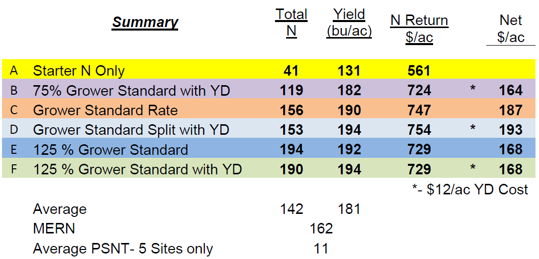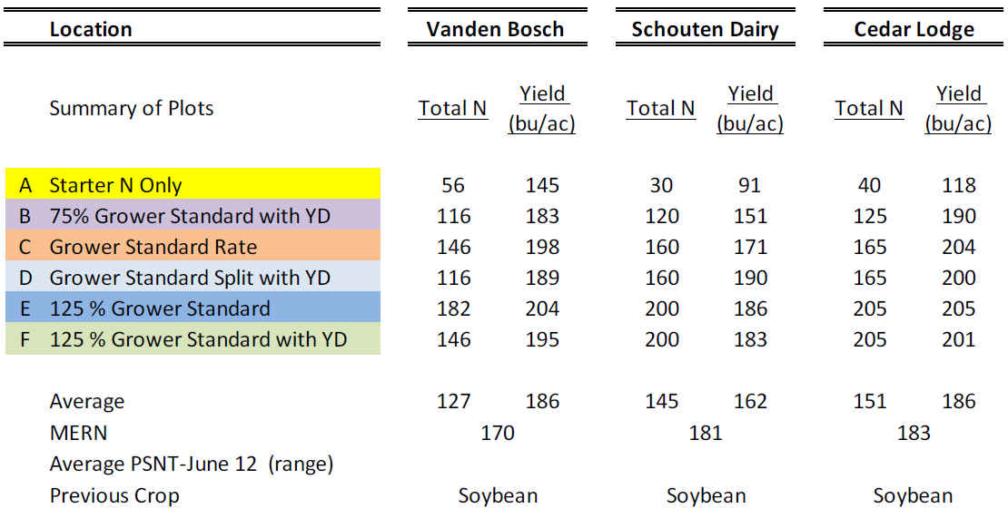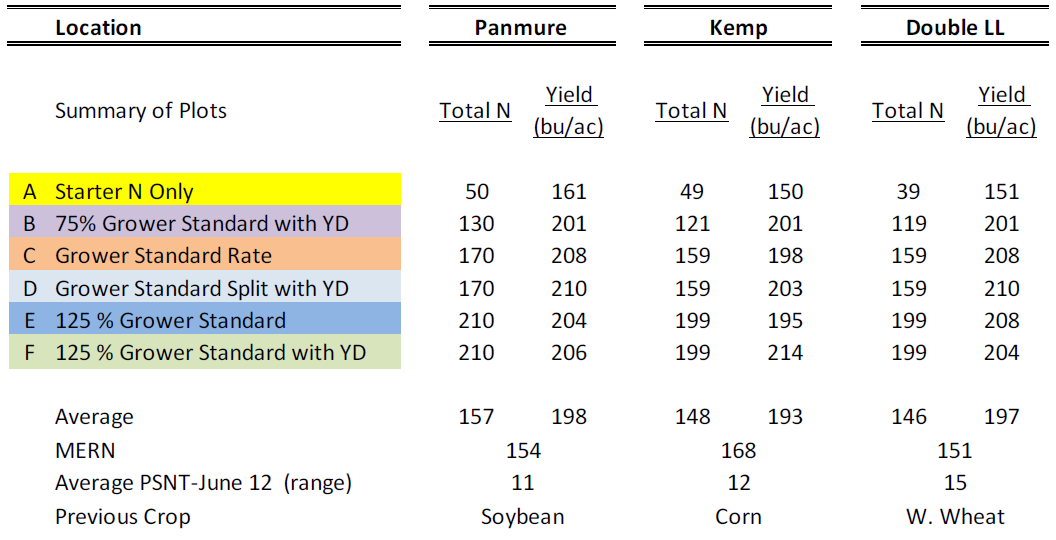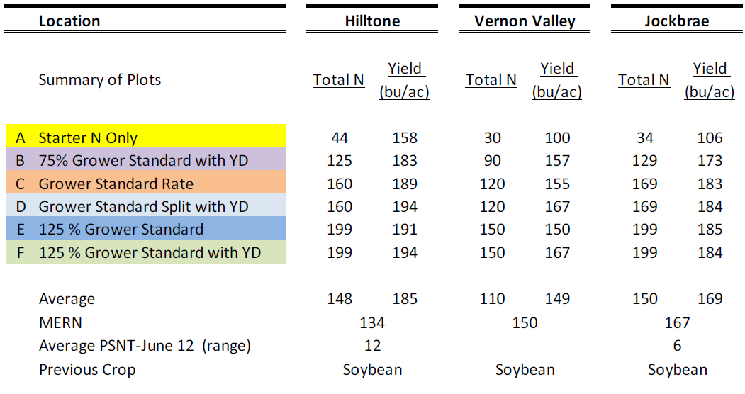 A: A base rate of 30-40 lbsN/ac at planting was established to aid in the calculation of Delta yield (difference in yield between low rate and higher rates of N applied) and MERN (Maximum Economic Rate of Nitrogen) values.