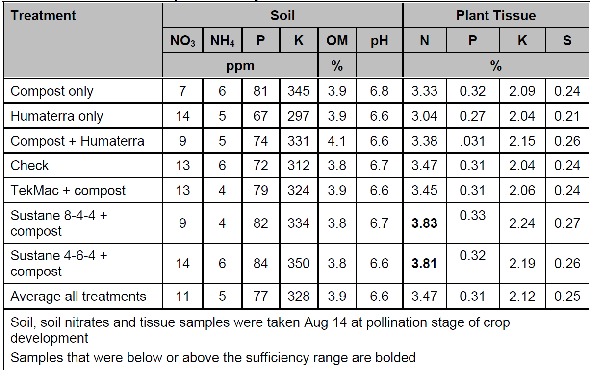 Plots were monitored and sampled at pollination timing. Soil fertility, soil nitrogen and plant tissue samples were taken at the area of the field where all treatments had the best growth and in the area where hand harvest occurred. Results are shown in Table 2, below, and indicate that there are no nutrient deficiencies showing up in any of the soil samples or in the plant tissues except for the treatment that had only humaterra biostimulant applied. The tissue N, P, K and S were was at the low end of the sufficiency ranges (shown in table 3) for those treatments.