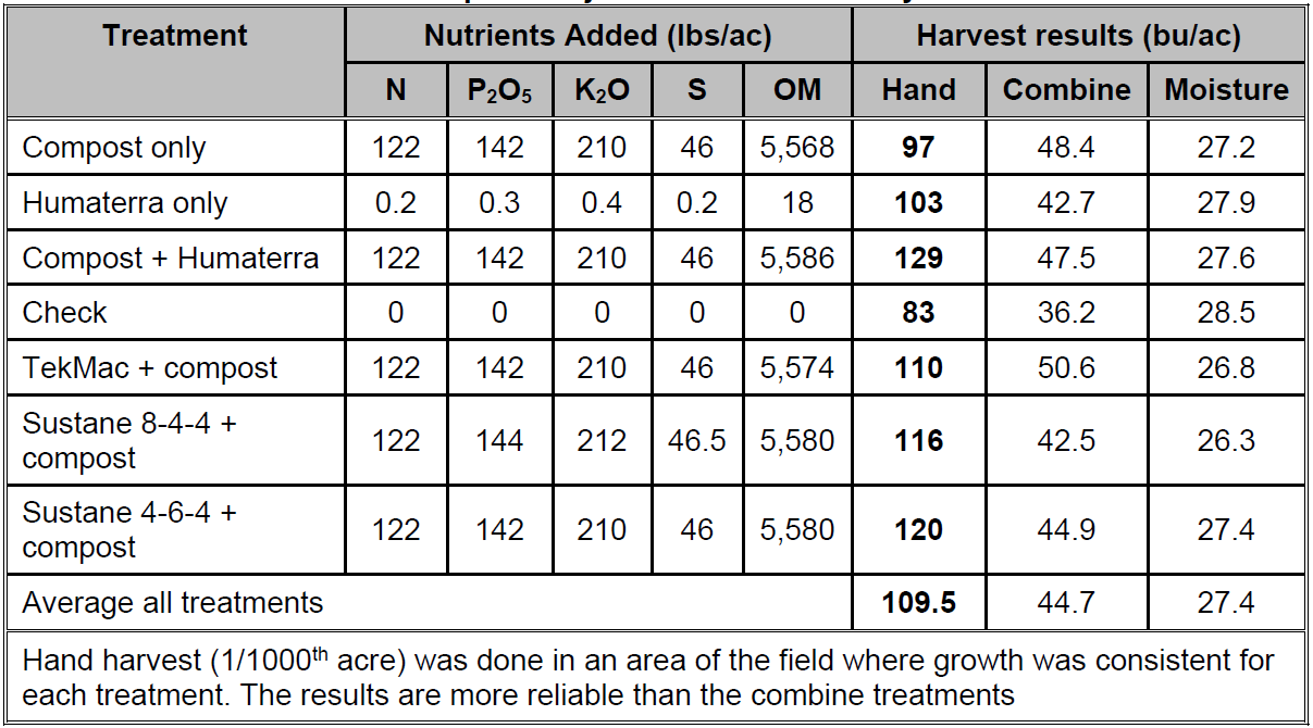 HumaTerra Soil Enhancer – ¼ inch pellets of soil enhancers made from matured compost mixes and ingredients including protein and energy sources) It includes a chemical and biological profile shown in table 1 below. It was applied in-furrow to the plots at 48 lbs/ac.