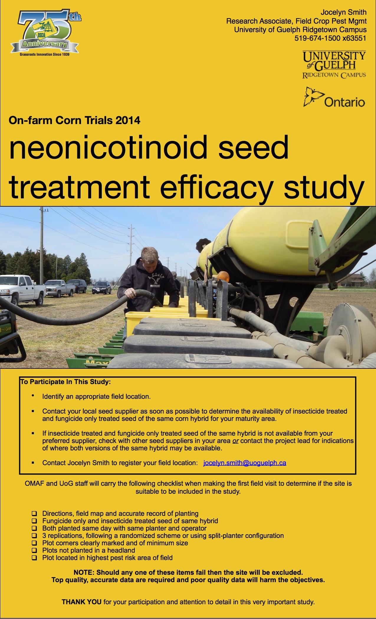 OSCIA, in cooperation with the University of Guelph (Ridgetown Campus) is looking for farm cooperators across Ontario willing to plant field-scale corn or soybean comparisons of neonicotinoid (e.g. Poncho, Cruiser or Stress Shield) versus non-neonicotinoids.