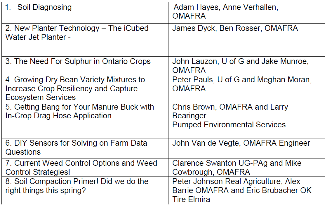 The FarmSmart Expo is a one day event, with the first day inviting farmers and agribusiness to the Elora Research Station of the University of Guelph. The participants are organized into small groups who rotate through a number of sessions that challenge them in problem solving current and obscure agronomic events that have been experienced in the field. The sessions also highlight new technologies and techniques.