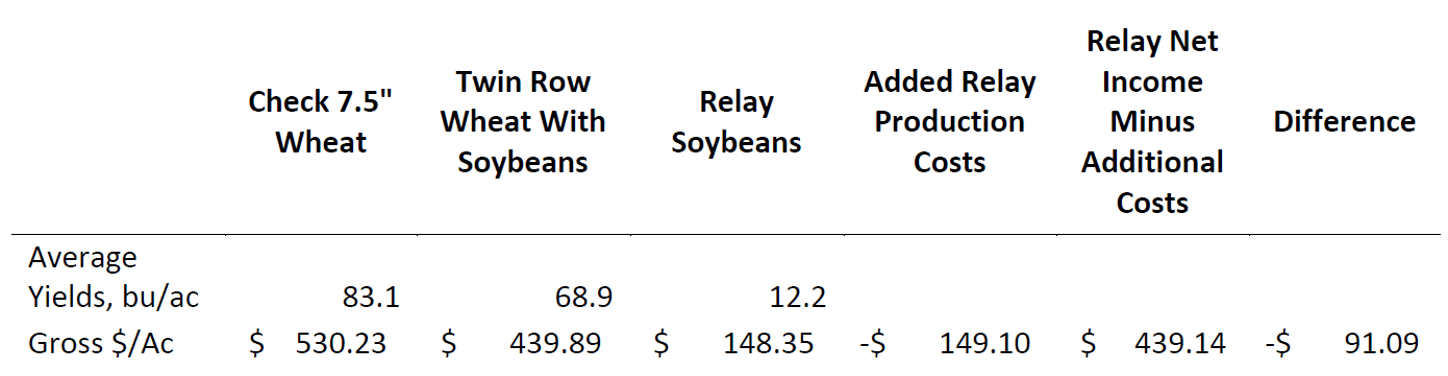 When doing a site by site analysis the only site to have a high return from the relay system over a regular wheat crop was in 2019 at Belmont. It can be assumed that it was due to only a 3.8 bushel yield difference in the wheat and a respectable 17.7 bushel soybean yield. The advantage to the relay system was only $19.10 per acre higher than a regular wheat crop.