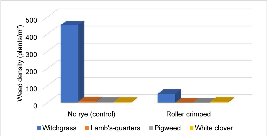 While the rye also greatly reduced weed pressure at the Elora-2020 site, it was not effective as a full-season weed suppressor. With a much higher weed density, the crimped rye strips still had 50 witchgrass plants/m2 (Figure 14). Because the mulch was not thick enough to prevent light from reaching the soil, without supplementary weed control witchgrass outcompeted the soybeans as the season progressed (Figure 15).