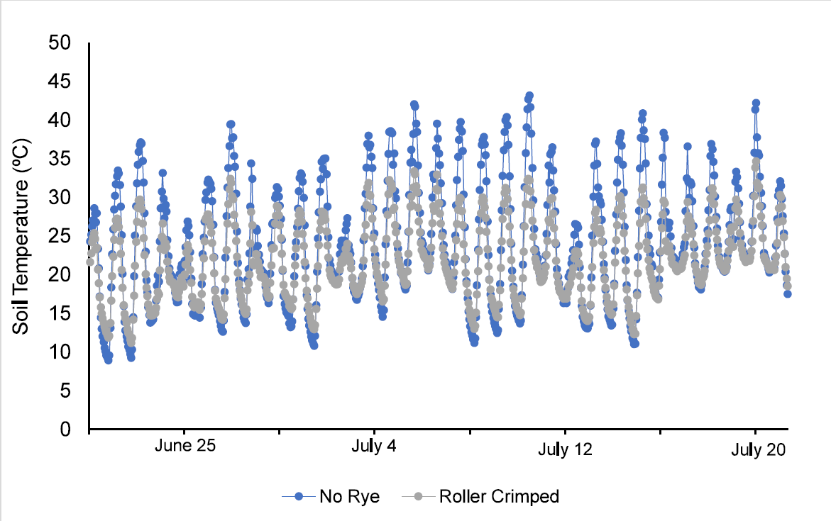 In the spring, rye slowed the soil from warming compared to the no-rye control at Elora-2019- daily maximum temperatures under rye were 5-?°C lower in late May and ear1y June. Throughout the summer, the rye mulch had a moderating effect on soil temperature. Soil in the roller crimped treatment had lower daily maximum temperatures and higher daily minimum temperatures than the no-rye control treatment (Figure 20). The soil temperature surpassed 40°C five times under the no-rye control but remained below 35°C throughout the hottest part of the season in the roller crimped rye treatment.