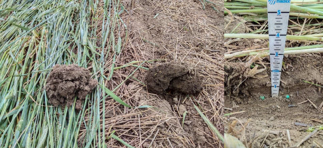 Figure 22. Significantly drier soil under rye relative to no-rye strip at Bornholm site on day of crimping and planting in 2021 (June 7; left). Soybean was seeded into dry soil under rye.