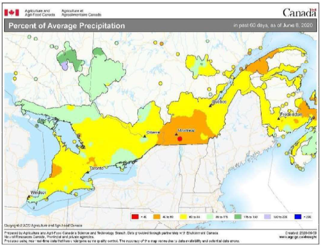 Figure 3. Percent of average precipitation in the 60 days leading up to June 10 (2019), June 8 (2020) and June 7 (2021) for central Canada (Agriculture and Agri-Food Canada).