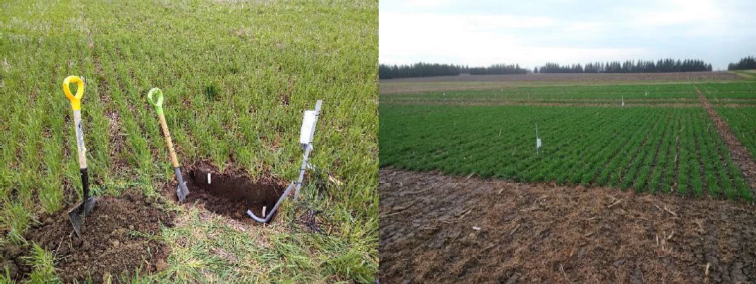 Figure 4. Soil temperature and moisture sensors installed at the Bornholm site in 2020 (left) and the Elora site, 2019 (right). Readings were logged hourly throughout the growing season.