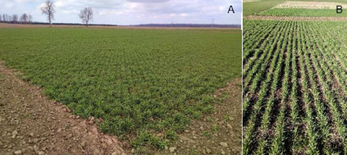 Figure 5. Thick cereal rye stand at Drayton-2020 site on April 30, 2019 (left) compared to a thin stand at the later-seeded Elora-2020 plot on May 1, 2020 {right)