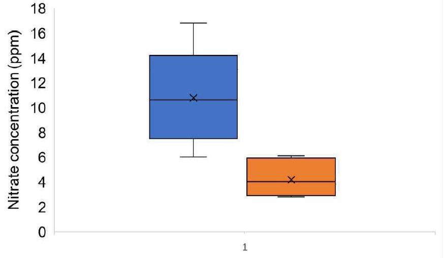 Figure 8. Box and whisker plots showing the median and average (x) nitrate concentrations (0-12 inches) from 7 strip-trials in 2019 and 2020.