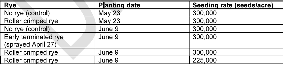 At Bornholm in 2020, additional treatments were included to evaluate the impact of soybean seeding date, soybean seeding rate and cereal rye termination timing. The treatments were:
