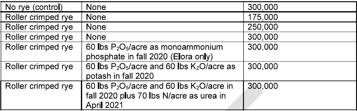 Added P, P and Kor N, P and K did not affect yield at Elora. At Bomholm, however, addition of nitrogen to rye in April resulted in a 7.1 bu/ac yield reduction relative to the P only treatment. The added nitrogen resulted in greater rye biomass and reduced soybean stands at both Bornholm and Elora. The lower stand at Bornholm was likely in part responsible for reduced yield in the treatment with added nitrogen.