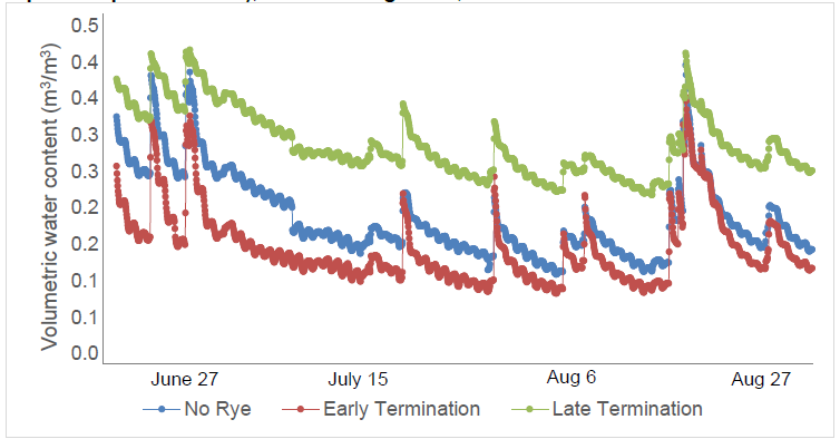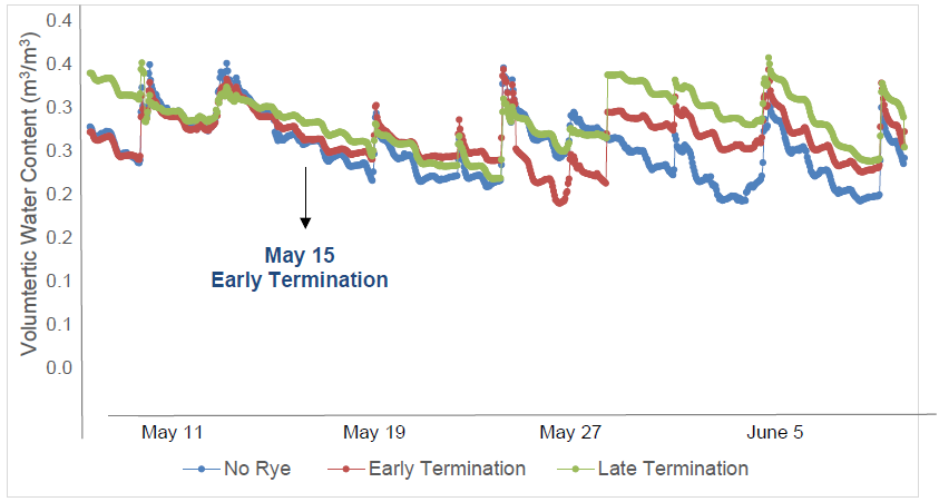 The difference in soil moisture was likely due to reduced evaporation from the soil underneath the rye. As the rye grew rapidly and headed out, however, it began transpiring more water, which helped dry out the soil. The residue from the early terminated rye likely contributed to slightly wetter conditions than the no rye control. In a dry spring, it is quite possible that the soil with the late terminated rye would have been drier than the no-rye soil.