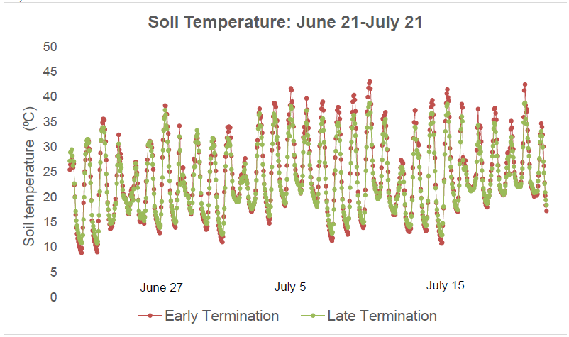 Figure 6. Soil temperature at 2-inch depth in early and late termination treatments at the Elora Research Station (mean of four replicates per treatment), June 21-July 21, 2019