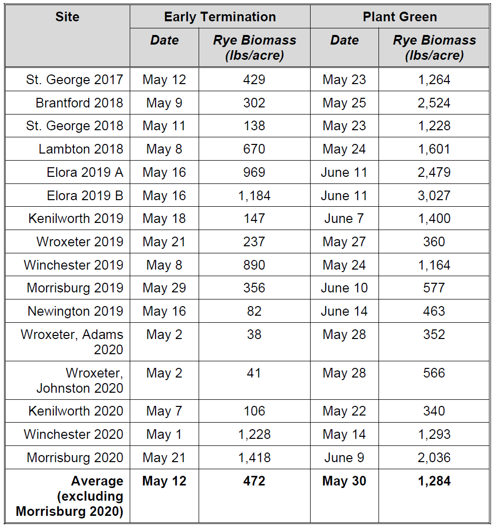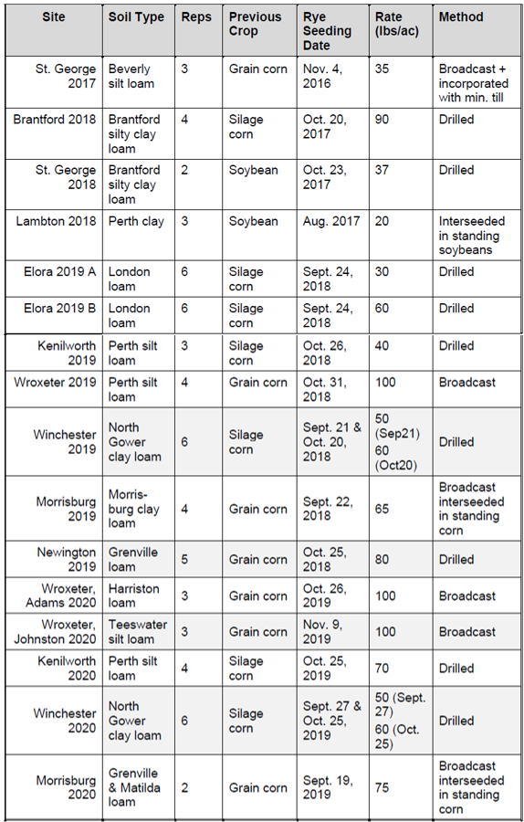 This project was supported by OSCIA Tier 1 (2018) and Tier 2 project funding. Donations of cereal rye seed were generously made by Cribit Seeds and Centre de Criblage de Marc Bercier. Thank you to Mike Cowbrough and Sebastian Belliard (OMAFRA) for their collaboration and to Ian McDonald (OMAFRA) for support with statistical analysis. Finally, thank you to all the farmer cooperators who have participated over the past four years.