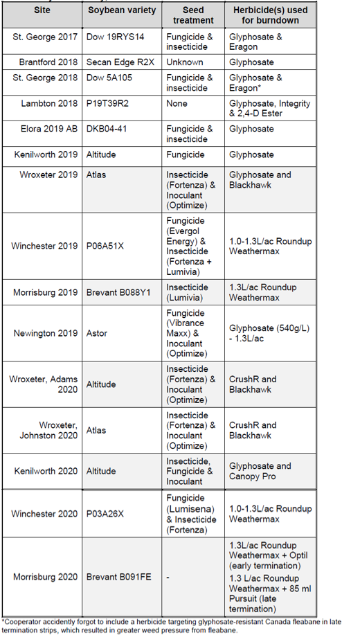 Table 2. Soybean variety, seed treatment and burndown herbicide for each site