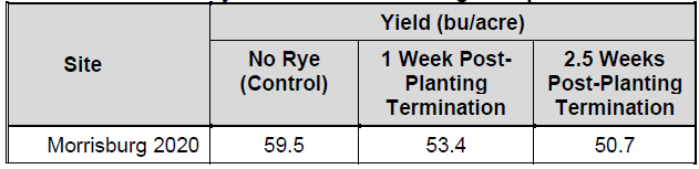 - Planting soybeans green into rye did not negatively impact yield relative to early termination; however, delaying termination until two weeks after planting did hurt yields in 2020