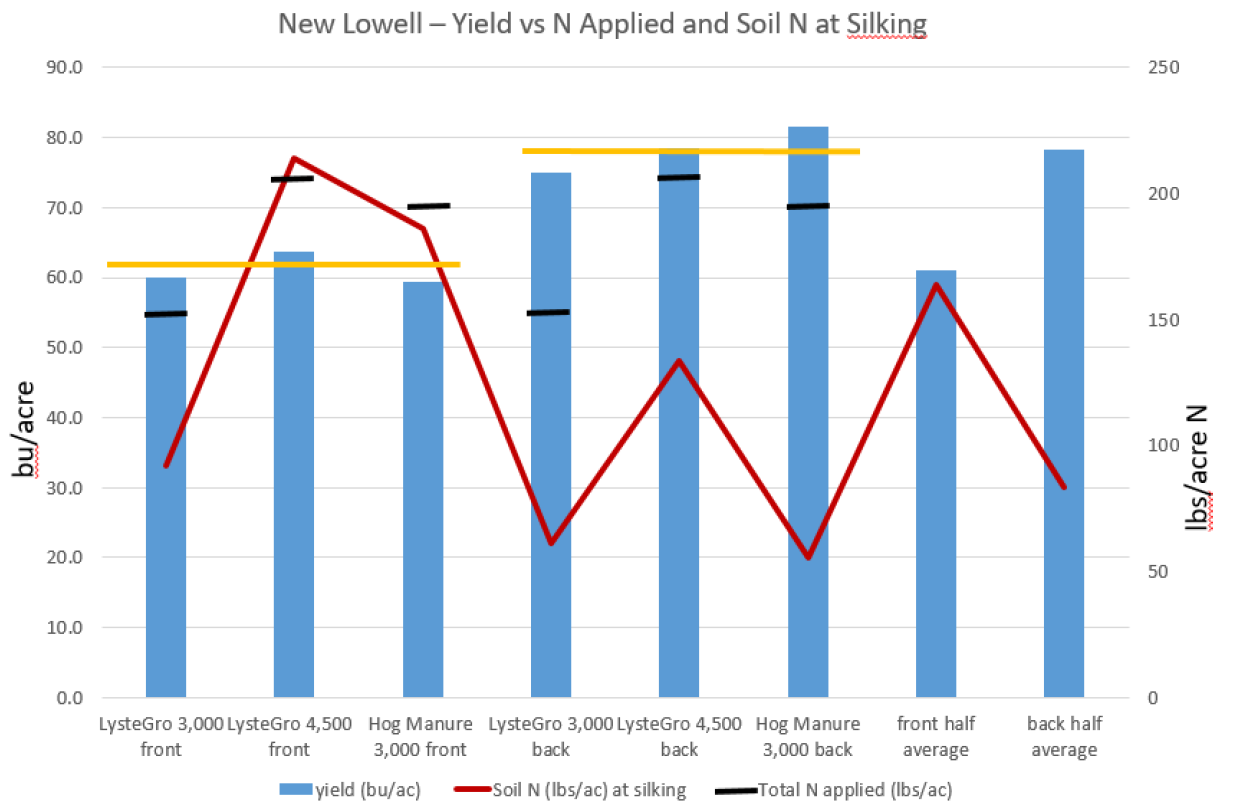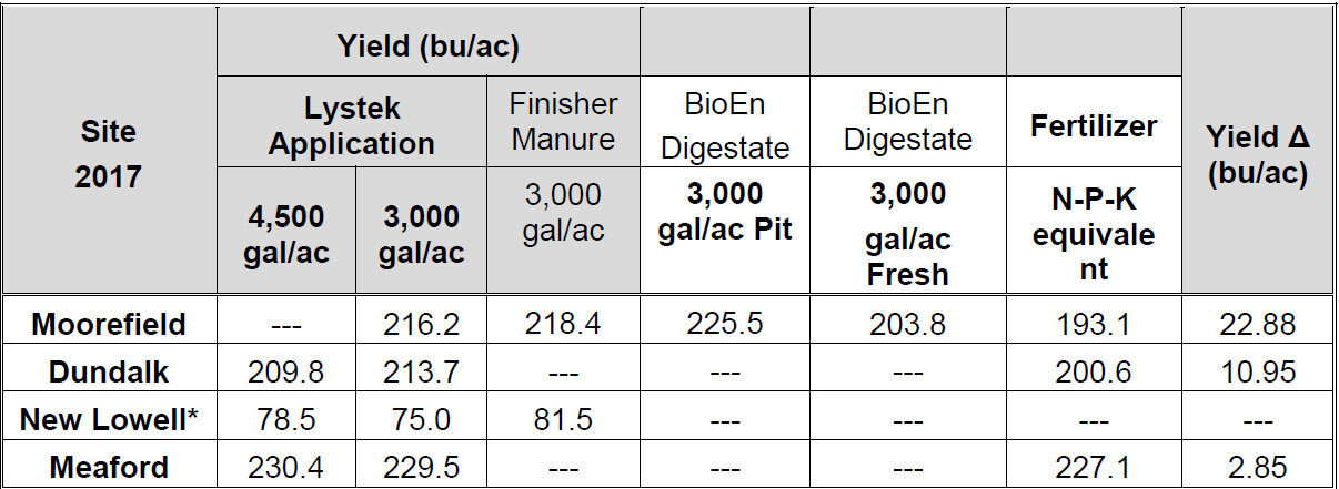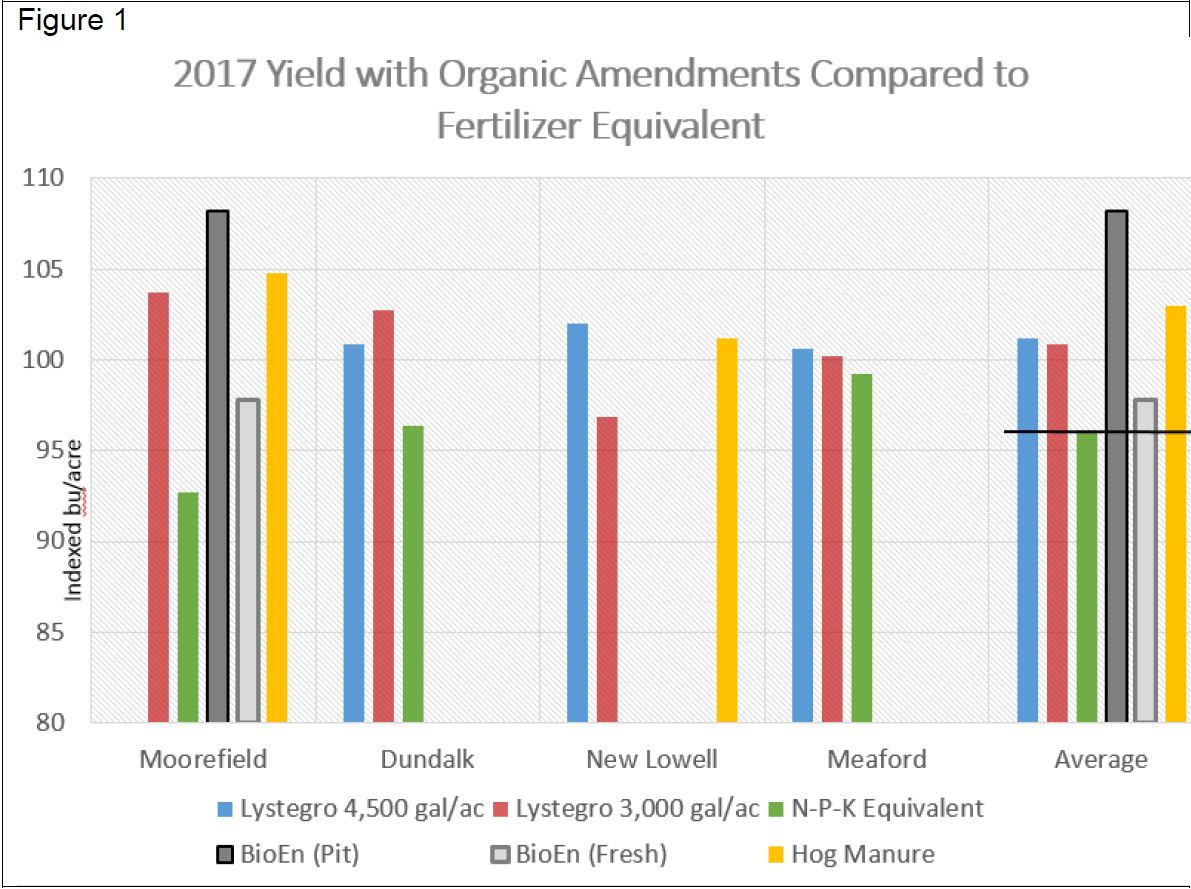 Table 7 shows the plot yields for the various treatments. A frost in late August affected the New Lowell site and resulted in significant yield reductions at that site. As a result, the data for 2017 was indexed to give a better indication of treatment response. The New Lowell site also had the Lystegro and Hog manure side-dressed in mid-June. This site did not have a commercial fertilizer check.