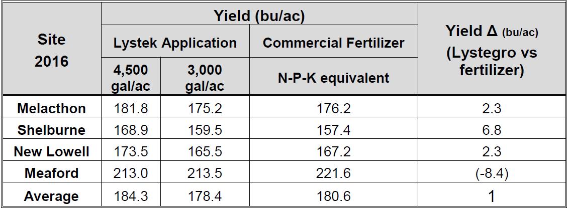 The Meaford site shows a yield response to the Lystegro. The 3,000 gal/ac application rate appears adequate for best yield results. At this site, the additional nitrogen applied from the higher rate did not appear to increase yield. Stalk nitrate samples from all the treatments were high at this site, but well over 2,000 ppm for the 4,500 gal/ac application rate. The soil nitrogen results in this field are higher than expected, even for the fertilizer check plots and the plant tissue results were also within the ideal range for growth. A stalk nitrate test of over 2,000 ppm is an indication that more nitrogen was applied than required for the crop. In this site a lower rate of nitrogen might have resulted in more economic yield.