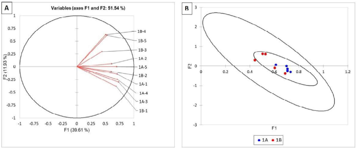 Figure 2. Statistical analysis of TRFLP of the fungal communities in corn roots of field 1. Fungal communities are represented as vectors (A) and as points with 95% confidence circles (B).