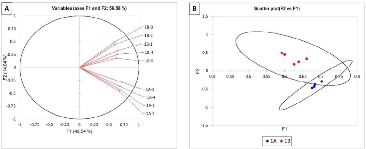 The composition of the bacterial and fungal communities of roots from sites A and B were analysed using TRFLP. We compared the microbial communities from both sites and summarized the results in two different ways: (A) As vectors: Figures 1A and 2A show each TRFLP result as a vector (bacterial and fungal, respectively). Each vector represents the community of one plant (named 1- 5). The closer the vectors are to each other, the more similar are the populations they represent. (B) As single data point: To visualize if there were any statistically significant differences between the communities from site A and B, we summarized our results as single data points and plotted them two dimensionally (Figures 1 B and 2B). The degree of separation between dots indicates the extent of similarities or differences. The further the dots are separated, the greater the difference. The closer they are, the more similar the population. Confidence circles (95%) that do not overlap are considered significantly different.