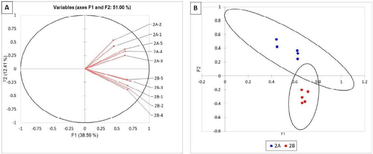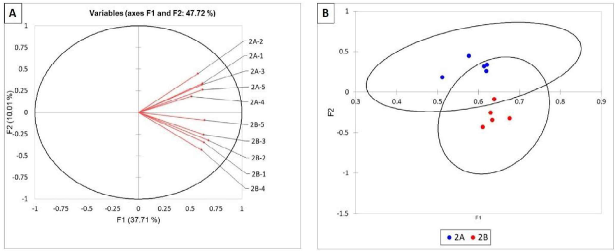 As shown on Figure 2A, the vectors of the fungal communities of the roots from site A were all grouped below the Oline whereas those from site B were all above. The cluster analysis grouped all the A components close to each other and the B components samples were also closely related (Figure 1 B, data as single points). This indicates that the fungal communities from site A and B were different, but the differences were not statistically valid as indicated by the overlapping confidence circles (Figure 2B). At the same time this is indicative of that some clear differences in the fungal communities exist at the two locations.