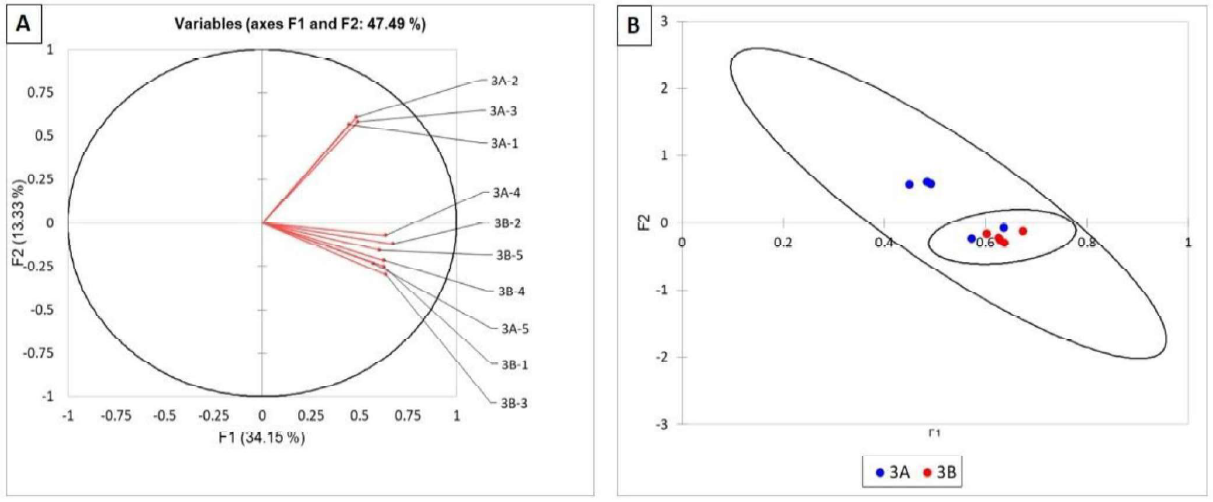 Figure 5. Statistical analysis of TRFLP of the bacterial communities in corn roots of field 3. Bacterial communities are represented as vectors (A) and as points with 95% confidence circles (B).