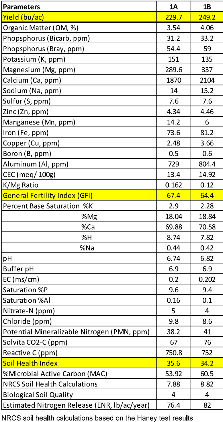 Site B produced 19.5 bu/ac more than site A (site B: 249.2 bu/ac vs. site A 229. 7 bu/ac). A summary of the soil chemical analysis and yield of field 1 is presented in Table 2 (raw data can be found in the appendix).