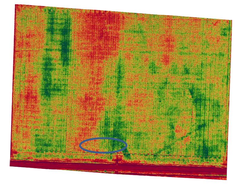 Each year of the project up to seven co-operators from each county (Lambton, Kent, Essex) will provide corn fields to be sampled. The cooperators must have a combine yield monitor and be able to generate yield maps for the field. Field location information is collected and sent to Warriner Ag. The location information is used to create field boundary maps. The maps are used by AGRIS Co-operative to have aerial imagery flown using Normalized Difference Vegetation Index (NDVI) technology for each field, see figure 1. This took place once the corn had reached the V10 stage (10 leaf collars) and no later than the R1 growth stage (silking – silks emerging from husks at tip of ear). The imagery was used to identify areas of the field that are healthy and areas that are stressed.